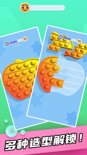 1、玩家需要拖动拼图碎片拼合成完整的泡泡板,完成后通过挤压泡泡释放压力,获得解压放松的愉悦体验。
