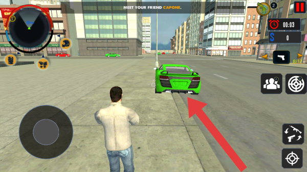 3、显示任务“MEETYOURFRIENDCAPONE(与你的朋友卡彭见面)”,呈现城市犯罪模拟玩法中的街头场景,有角色、车辆、操作按钮等元素,属于开放世界犯罪模拟类。