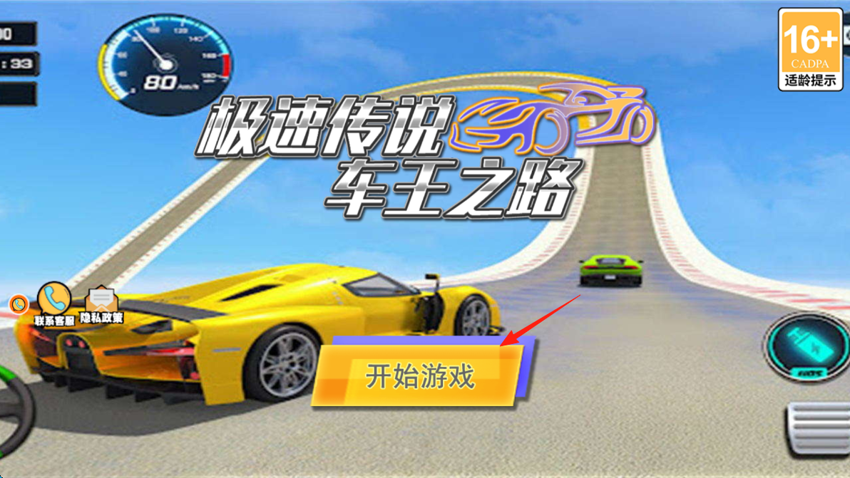 1、进入《极速传说:车王之路》主界面,看到炫酷赛车与高空赛道,点击“开始游戏”,投身刺激竞速,在赛道上,利用加速、漂移技巧,挑战高空坡道、弯道超车。