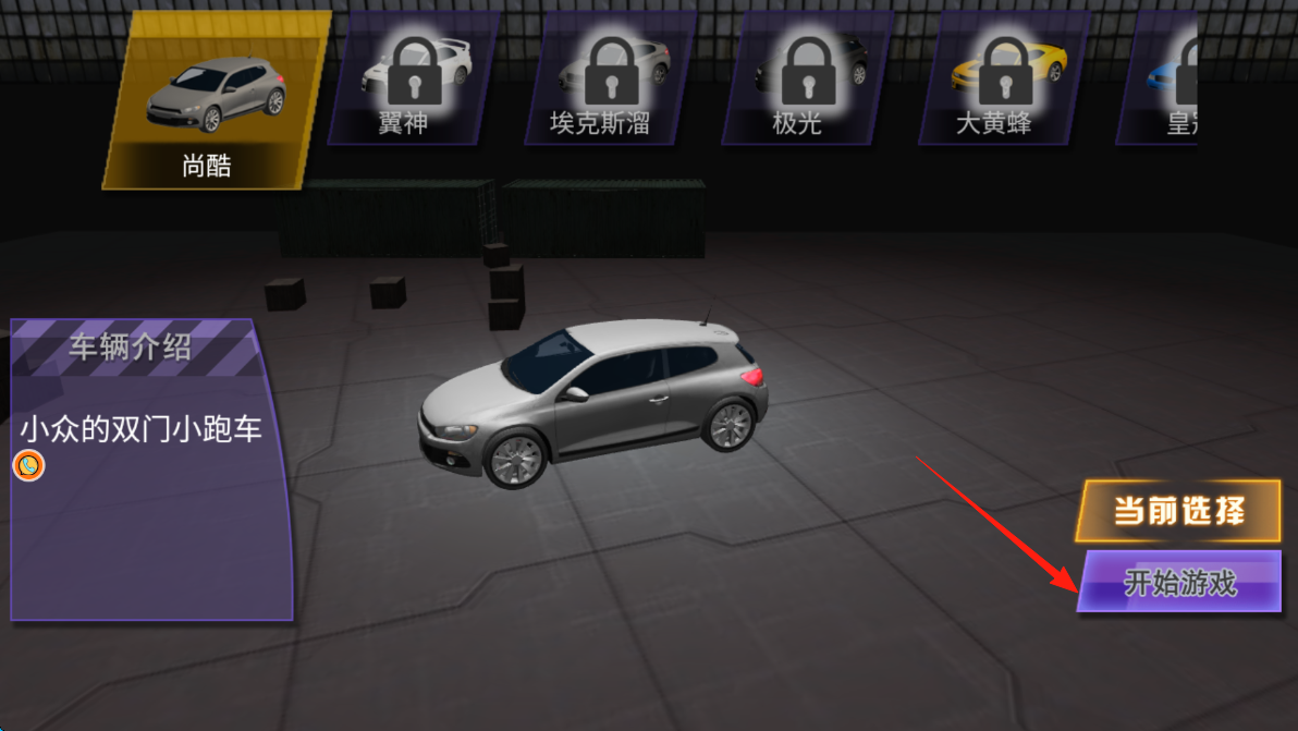 2、来到车辆选择页,“尚酷”等赛车可选(部分需解锁),选定“尚酷”后,查看车辆介绍(小众双门小跑),点击“开始游戏”,驾驶该赛车出征。