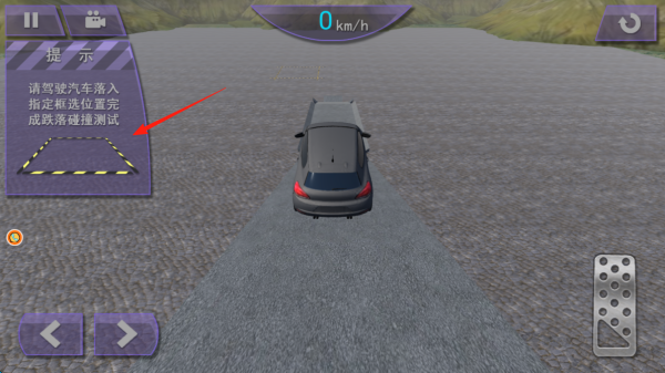 3、进入特殊测试关卡,按提示“驾驶汽车落入指定框选位置”,完成跌落碰撞测试,操控车辆加速、调整方向,精准冲进黄黑警示框,触发碰撞。