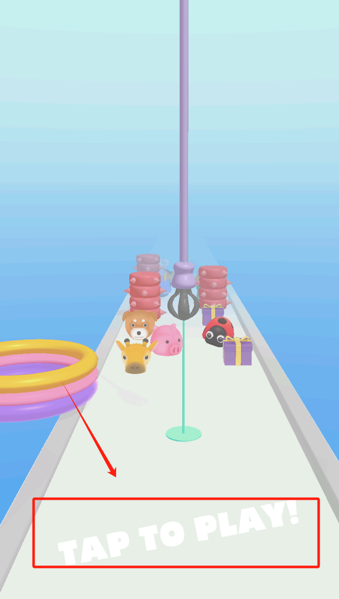1、看到启动界面中间写着“TAP TO PLAY”,直接点击屏幕任意位置就能开始游戏,那个紫色吊臂就是待会要用的抓钩。