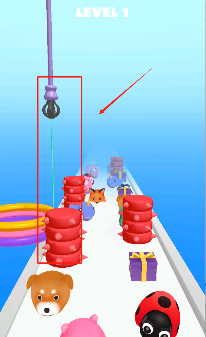 2、第一关开始后,传送带上会跑着各种小动物和礼物盒,看准时机点击屏幕让抓钩下去抓东西,注意不要碰到红色障碍物。