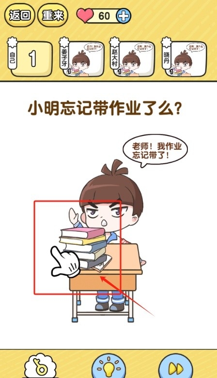 2、观察到小明举着手说忘带作业时,点击红框圈住的手开始检查,界面上方显示有60次提示机会,可在卡关时使用。