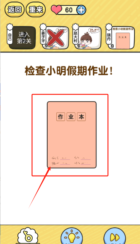 3、点击红箭头指向的作业本开始检查,注意查看界面中的爱心数(当前为60),若检查出错,可点击重来按钮重新操作。