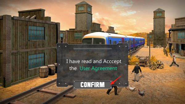 1、在西部风格场景中,弹出用户协议确认框,勾选“I have read and Accept the User Agreement”后,点击“CONFIRM”确认,完成进入游戏前的必要协议流程。