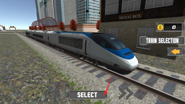 2、进入火车选择界面,面对停在铁轨的高速列车,点击“SELECT”选定该火车,可左右切换查看其他火车(箭头按钮),选定后进入驾驶环节。