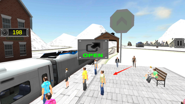 3、火车抵达站点,在雪景车站场景中,乘客聚集在站台,需操控火车相关功能(如“OPEN”按钮开启车门),组织乘客有序上下车,留意时间(左上角“198”计时)与乘客需求。