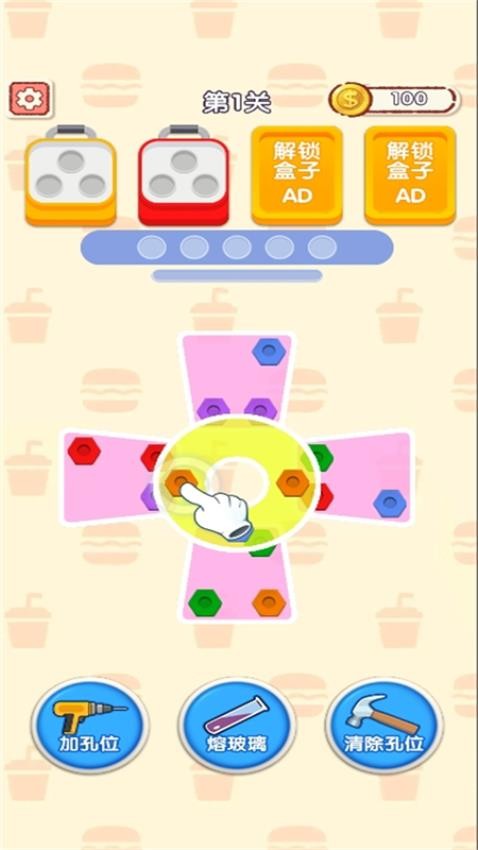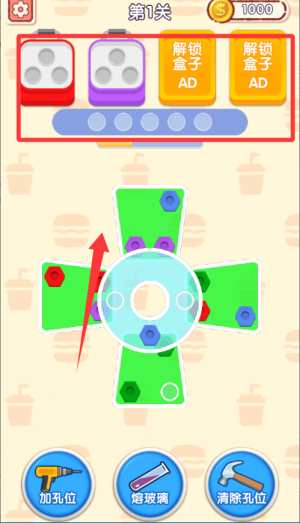 1、进入关卡后先观察钉子和透明板的颜色分布,找出它们之间的对应关系。按照颜色分类将钉子收入相同色彩的盒子中完成消除。