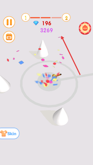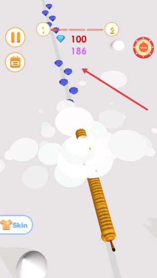 2、滚动时,借轨道引导改变方向,在泡泡、彩色区域加速,积累钻石,提升分数(如186、3269)。