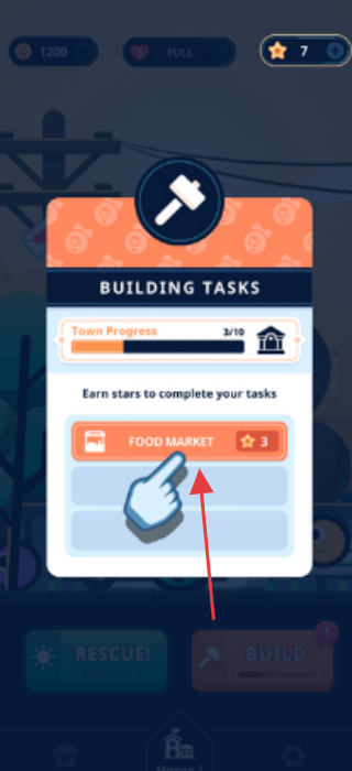 1、在游戏前期,点击【FOOD MARKET】(箭头指向),完成建造任务,获取3颗星,推进城镇进度,解锁更多建筑和玩法。