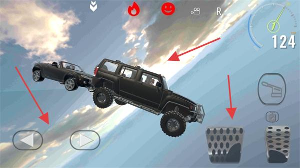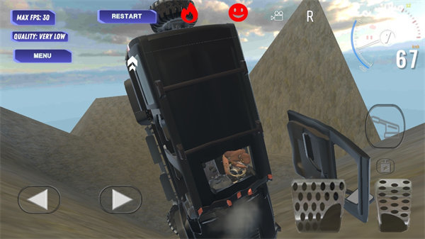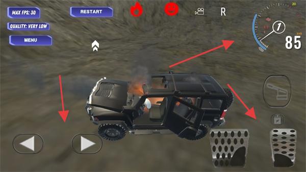 2、在驾驶界面(第二、三张图 ),用左右箭头按钮控制方向,下方踏板控制加速 / 刹车,驾驶汽车完成特技、越野等挑战,留意速度表、车辆状态(着火等)。