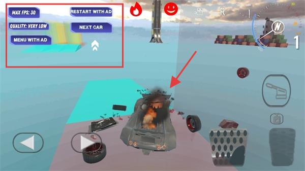 1、进入游戏,若车辆损毁(如首图着火状态 ),可点 “RESTART WITH AD(看广告重开)”“NEXT CAR(换车)”“MENU WITH AD(看广告回主菜单)” 重新开始。