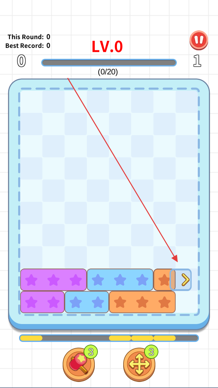 2、在游戏棋盘,拖动底部彩色方块到网格空位,拼接消除同色方块,达成消除目标推进关卡。