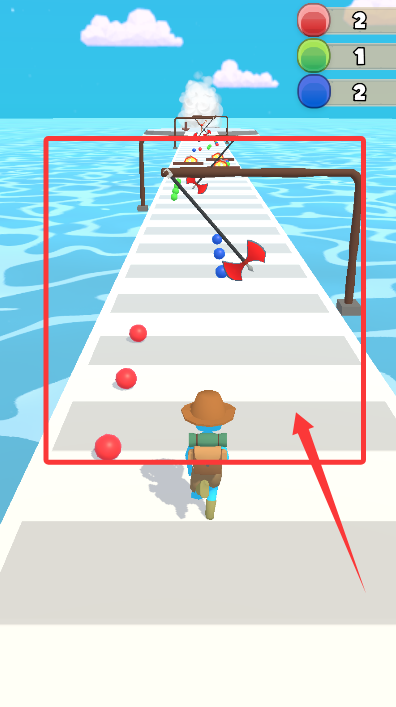1、进入游戏,操控角色在路径上前行,收集沿途散落的彩球道具并及时避开机关障碍。