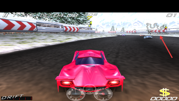 3、比赛时操控粉色赛车,在雪地赛道上行驶,注意弯道漂移(看【DRIFT】条),赶超对手,冲向终点赢取奖励。