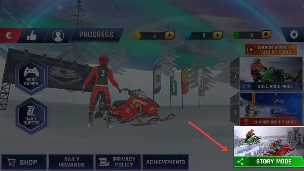 1、点击【STORY MODE】,进入雪地摩托故事模式赛事,开启剧情赛道挑战。