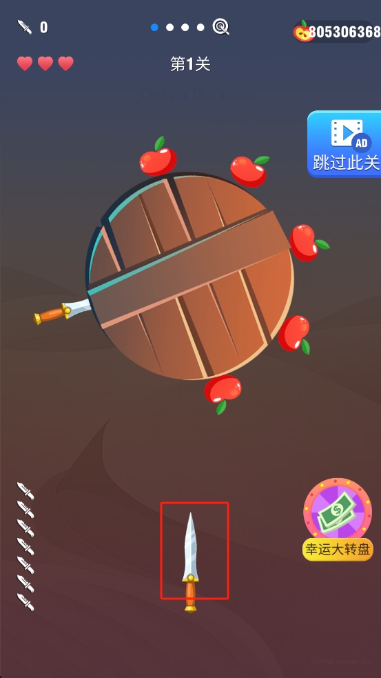 2、圆盘在缓缓转动,上面已有几把飞刀插着,看准空隙点击屏幕发射飞刀,看着飞刀稳稳插入圆盘很是满足。