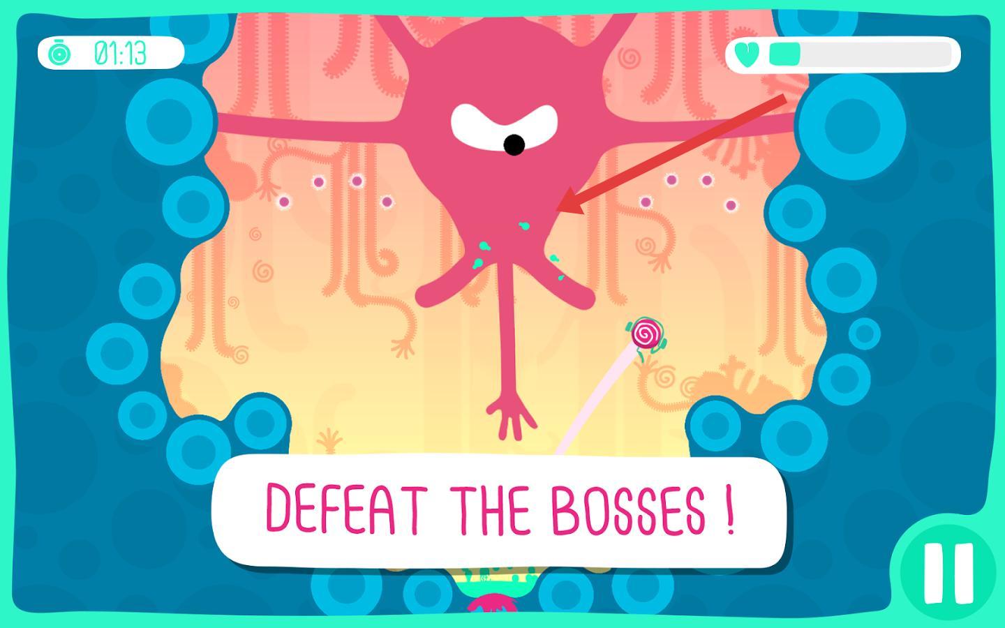 2、遭遇boss关卡,依据“DEFEAT THE BOSSES”提示,操控武器攻击粉色怪物,把握攻击节奏击溃首领。