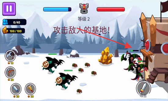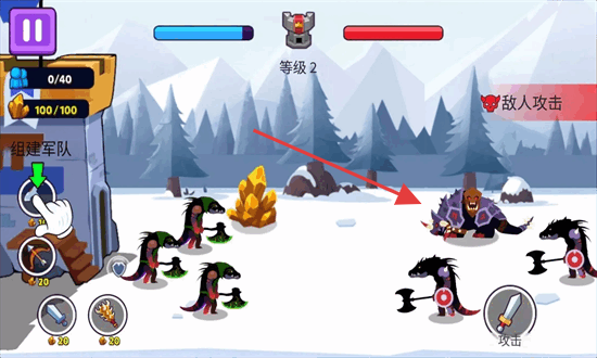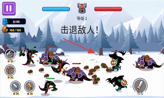 2、“攻防战斗”,指挥军队出击,先在极地场景击退来袭敌人(野兽部落),守护己方基地。