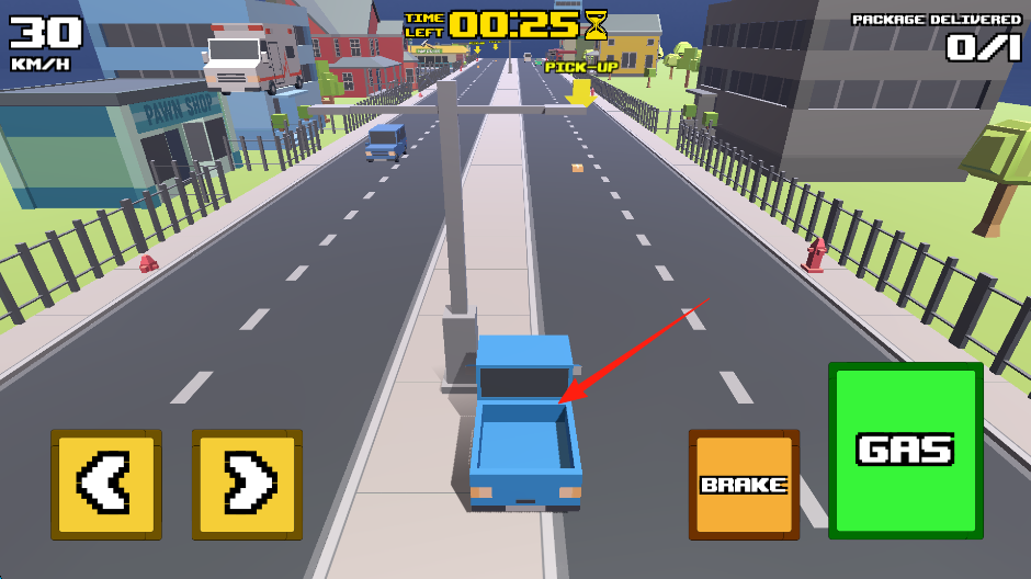 2、进入驾驶场景,操控蓝色皮卡,利用“GAS”“BRAKE”按键控制速度,躲避车辆(如救护车),限时内完成货物运输,在街道场景中完成运输任务,体验时间限制与障碍躲避的玩法。