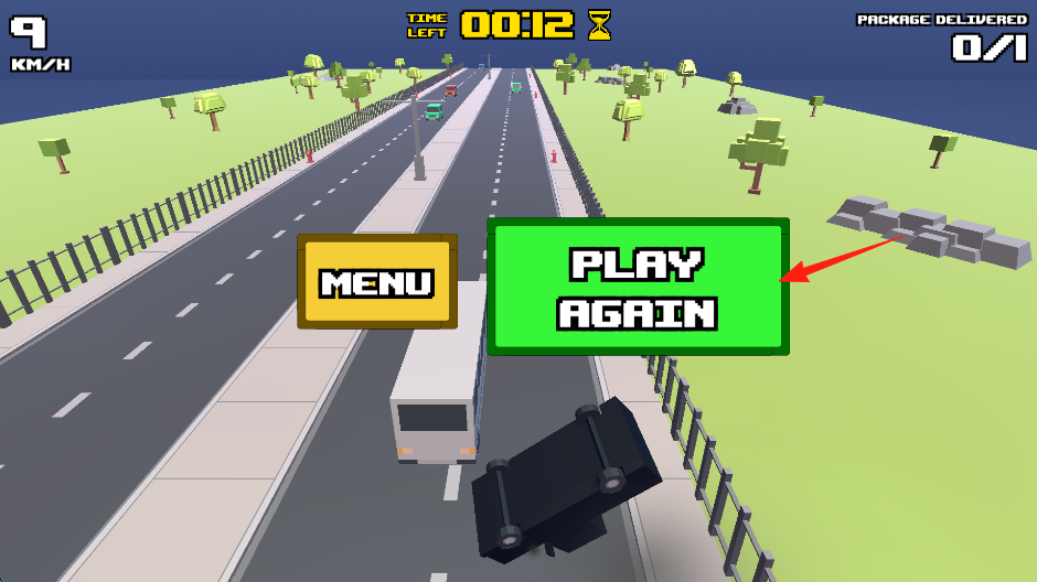 3、若驾驶失败(如车辆侧翻),点击“PLAY AGAIN”重新挑战,可返回“MENU”更换模式,修正驾驶策略,再次尝试完成运输,通过失败重启机制,反复练习驾驶技巧。