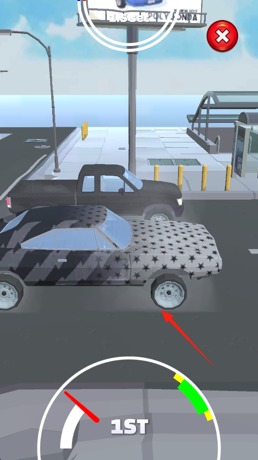1、进入赛车场景,操控印有星星图案的赛车,在街道上行驶,注意避开周围车辆(如黑色皮卡),观察仪表盘(1ST挡位),通过转向、加速等操作,适应城市道路环境。