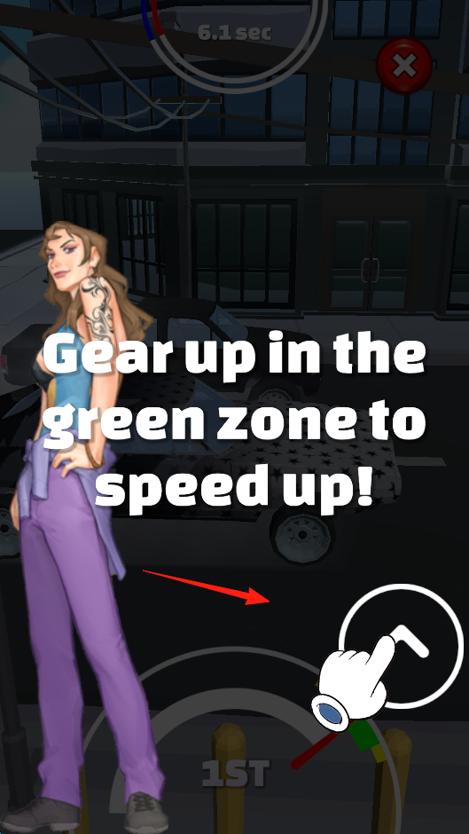 2、遇到提示界面,按指引在绿色区域换挡(“Gear up in the green zone”),点击对应按钮提升挡位,成功换挡后,赛车速度加快,需把握时机操作。