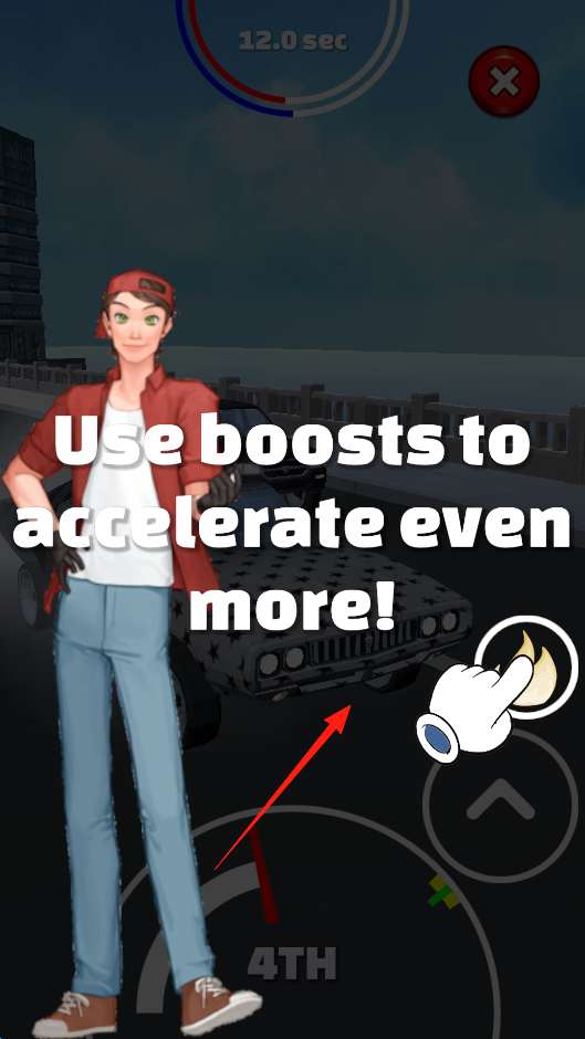 3、触发加速提示,点击“boosts”按钮,让赛车进一步加速,在行驶中合理使用加速道具,超越对手或缩短时间,体验道具加速玩法,借加速机制提升竞速快感。