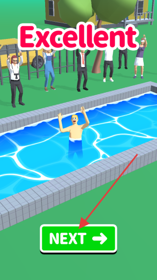 3、成功落入泳池,出现【Excellent】评价后,点击【NEXT】,进入下一关,继续跳跃闯关。