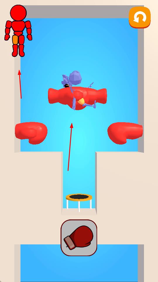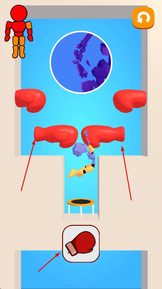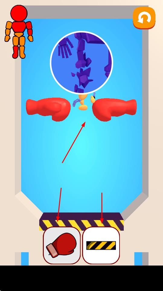 2、“拳击手套机关”,点击拳击手套道具,触发红色手套机关,改变人偶运动轨迹,破碎紫色障碍。