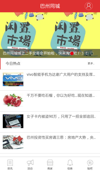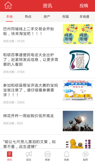 巴州同城是一款巴城地区的详细的生活资讯信息服务平台,实时的为你提供便捷的服务,特色的闲置市场服务让你在线淘到更多的好货,化更少的钱享受一样的服务,在这里从多角度的介绍巴城让你快速便捷的的了解到巴城,喜欢的用户快来下载吧!