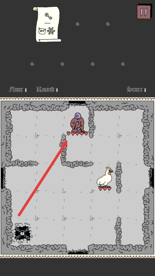 2、地牢探索时,操控角色移动,按箭头指引,在Floor-1探索,遭遇大白鹅等生物,触发互动。
