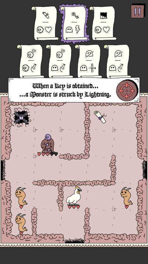 2、策略智力考验:考验玩家的策略与智力,需在面对怪物时选择消灭或躲避,合理规划路线寻找卷轴与钥匙,逻辑推理能力随关卡提升面临更大挑战。