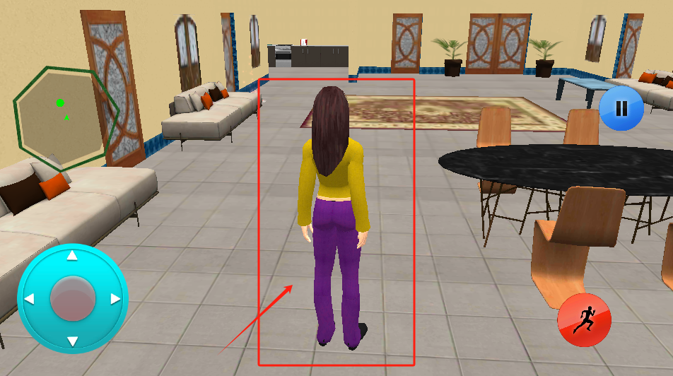 3、控制角色在客厅活动,点击红框里的长发人物进行互动,开启家庭生活相关的剧情或任务。