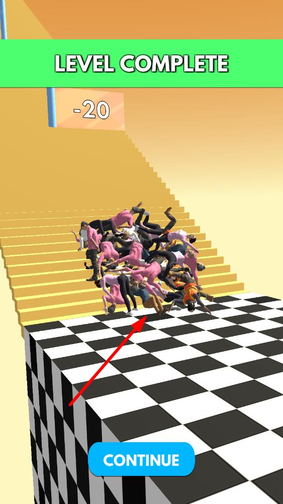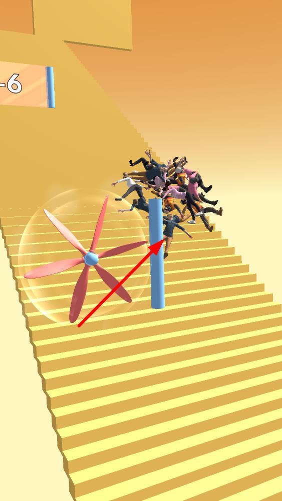 1、人数累积机制:随着推进,人群数量不断增加,越多的人一起滚落楼梯,视觉冲击力越强,带来的爽快感也随之升级,激发玩家收集人群的动力。