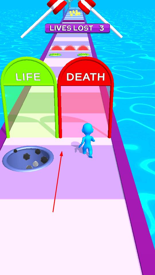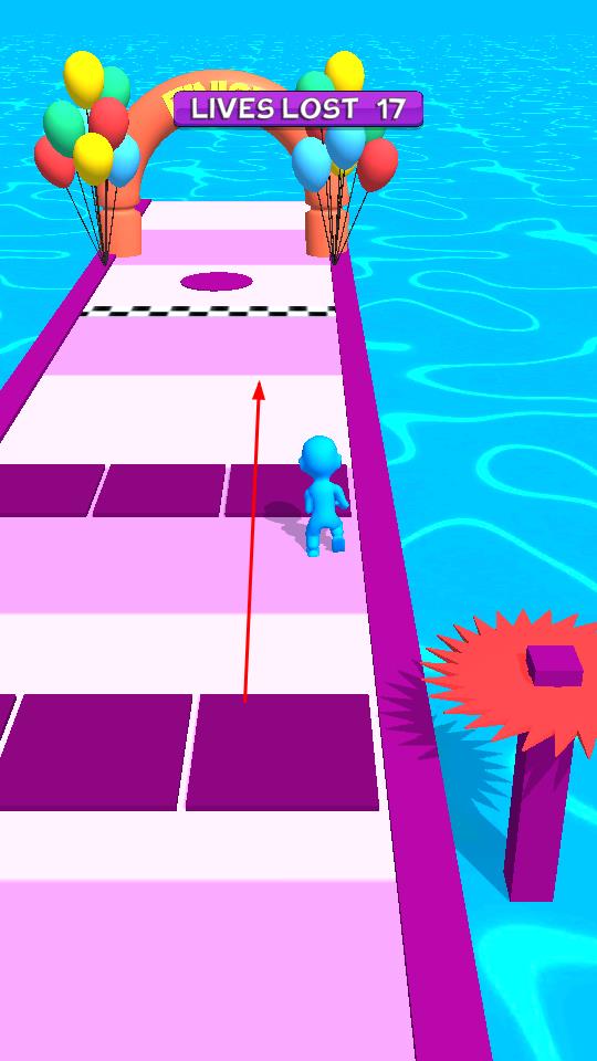 3、“关卡挑战”,在跑道上躲避旋转锯片、文字陷阱,冲向气球拱门终点,完成关卡,刷新生命损失记录。