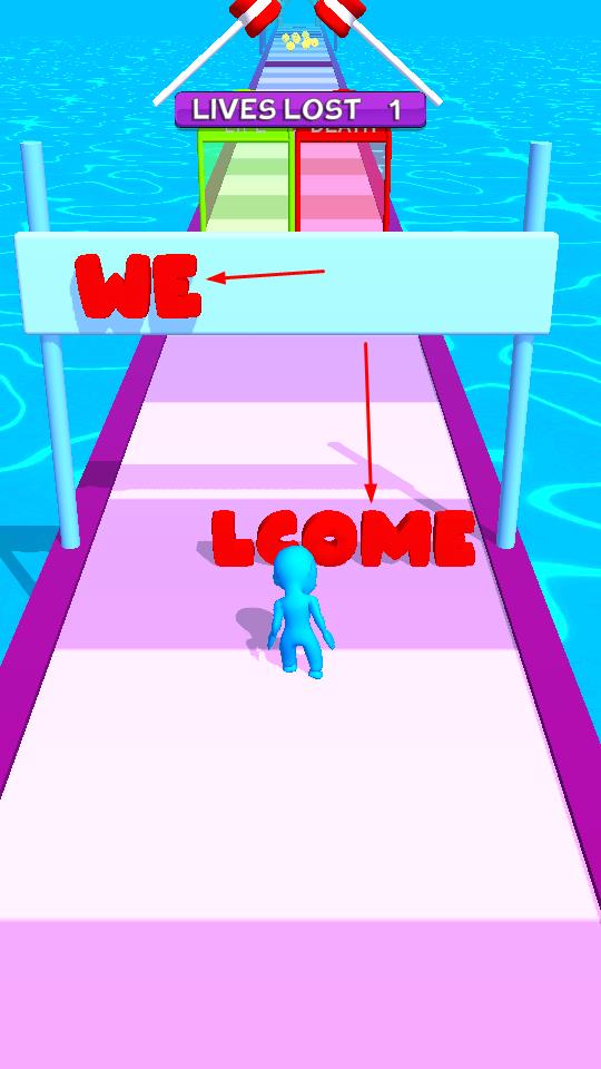1、“文字障碍”,操控蓝色小人沿水上跑道前进,避开“WE”“LCOME”等文字障碍,调整移动方向。