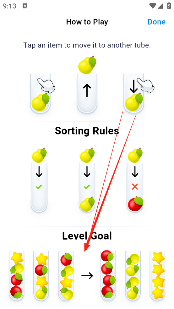 1、进入教学界面,学习物品分类规则,点击梨形物品,按箭头指引移动到对应试管,遵循同类型物品归位规则,借教学引导掌握操作,体验分类玩法的基础逻辑,为关卡挑战做准备。