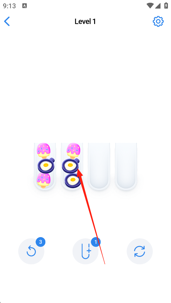 2、在Level1关卡,观察试管内的甜甜圈、煎蛋物品,点击目标物品,移动到空试管,需按物品类型分类,将相同图案的物品归置一处,体验基础分类操作,感受关卡初始挑战。