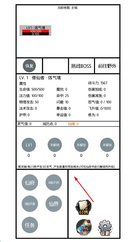 1、进入游戏后创建修仙角色,选择灵根属性与初始门派,在新手引导中学习功法修炼与基础回合制战斗操作。