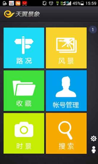 天翼景象客户端界面呈现九宫格展示风格,用户可以根据不同的应用场景需求自行添加应用、添加系统推荐的热点或事件全球眼。