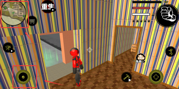 3、左边的圆圈是移动方向的按钮,上的是小地图可以观察自己的所在地址。