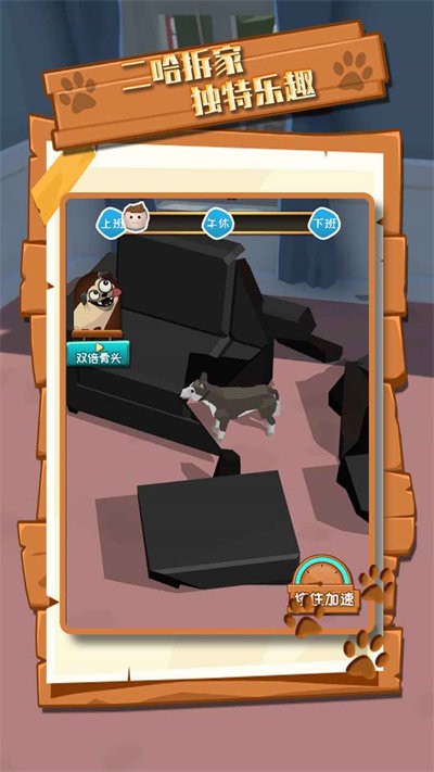 3、在主人回家前完成当前关卡的破坏任务,获取奖励升级狗狗的拆家能力,解锁新的狗狗和场景,体验更具挑战性的拆家过程,享受持续的解压乐趣。
