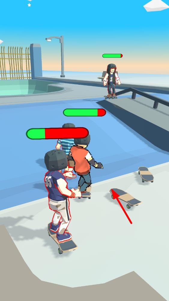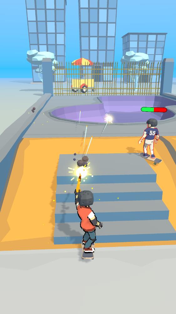 滑板冲突是一款以滑板竞技为核心的有趣体育,采用3D卡通画面,将人物效果卡通化,呈现出轻松有趣的视觉风格,主打竞技对抗,玩家专业滑板场中,既要展示酷炫的滑板特技,又要应对前方的敌人,利用武器展开战斗,通过快速滑动点击屏幕操作,战胜对手可获得奖励,用于解锁更多好看的滑板和皮肤,多样的模式和丰富的道具武器。