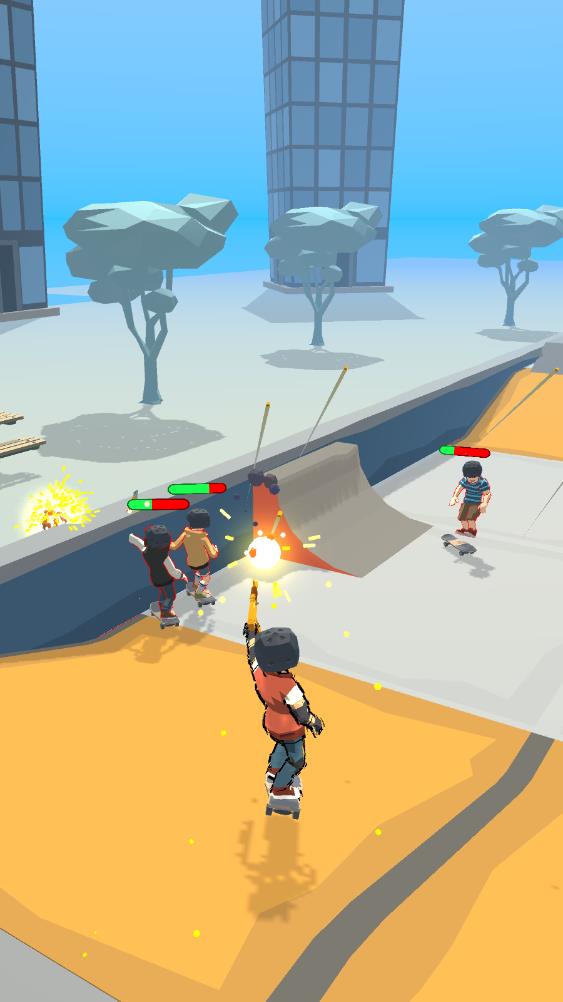1、卡通竞技风格:精致简单的风格搭配酷炫滑板特技,融入多种武器元素,让玩家与敌人的激烈战斗中,感受轻松与刺激并存的竞技体验。