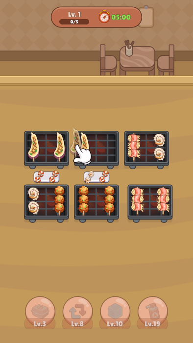 2、关卡设计精心打造,包含15个主题各异的厨房场景,从家庭烤架到专业厨房,每个场景都影响烧烤策略,特殊"限时狂欢"需要达成条件开启。