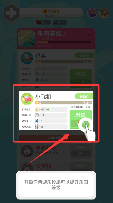 3、在管理界面选取已建的项目,投入资金进行扩建升级改造,增强娱乐效果与园区品质。