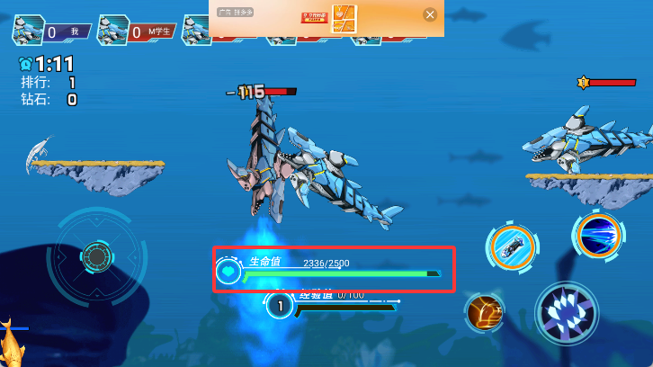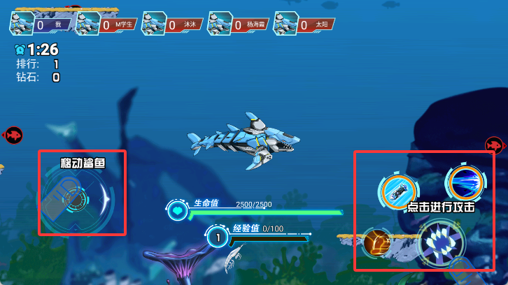 2、左下角摇杆移动鲨鱼,右下角按钮控制鲨鱼进行攻击。