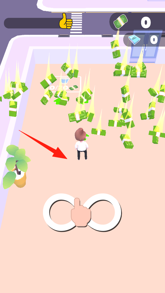 1、进入游戏场景,操控角色在满是钞票的区域移动,通过滑动下方环形按键,引导角色收集散落的钞票,体验收集资源的乐趣,感受轻松解压的玩法氛围。
